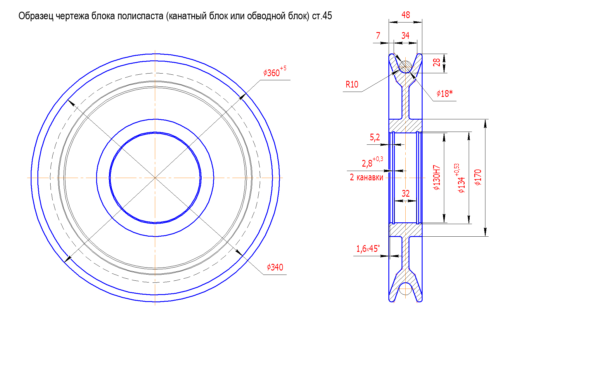 Полиспаст крана или канатный блок изготавливают либо из литых чугунных заготовок (выгодно только при большом объеме заказа от 50шт) либо стального проката стали 15,20 и 45 с последующей механической и термической обработкой твердости от 30 до 48 HRC.